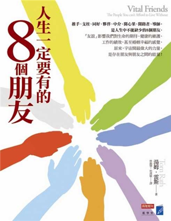 另外,本書提供的英文網站測驗(www.vitalfriends.com.),幫助讀者檢視周遭朋友在個人生命與工作中,各自扮演著哪八種不可或缺的朋友角色【這八種角色包括:推手(Builder)、支柱(Champion)、同好(Collaborator)、夥伴(Companion)、中介(Connector)、開心果(Energizer)、開路者(Mind Opener)、導師(Navigator)】。