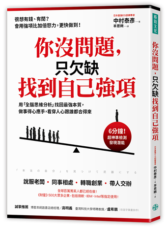 每個人的思考取向都有著自己的偏好和優點,若能順著這個優勢,做事就會得心應手,事半功倍。全腦思維分析獨創的檢測與解說,能幫你找出自己的「首要思考取向」,也就是「核心才華」,一旦能夠加以發揚,便能創造出良好成果,進而贏得他人讚揚。