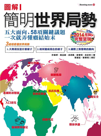 本書即為讀者牽起其中大勢所隱含的思考軸線,讓讀者循著線索方向找到關鍵因素。2014年出版的《圖解簡明世界局勢》更為讀者掌握新穎的57項重要議題,藉由此書可通達全球發展的主要脈絡。提供讀者最新的數據解析各國目前真實概況、精闢的論述提升對時事判讀的敏銳度,再搭配圖解說明輕易掌握住核心演變的過程,如此以來更能夠讓清晰的理路完整地觀看整個世界版圖。