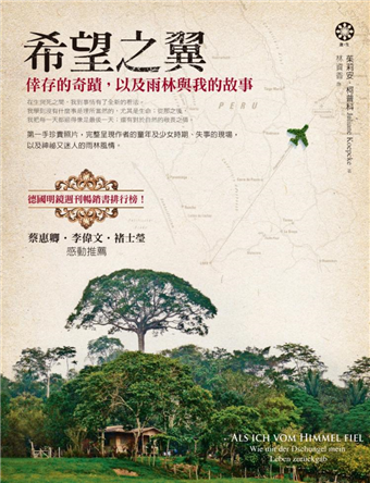 有時候看一部精彩的電影,能讓你有身歷其境的震撼,但那畢竟只是「電影」,是小說家與編劇們對現實細節的白描鏤刻,為的只是要加強其藝術作品中真實的感染力。《希望之翼》這本書可不是編出來的小說,而是一位從空難中死裡逃生「墜機少女」茱莉安的真人真事!很多人死裡逃生後,都會對生命有了一種頓悟;朱莉安在墜機生還後,則是對「拯救」她的那座熱帶雨林「潘瓜納」付出實際行動:努力希望讓秘魯政府將「潘瓜納」設為自然保護區,使她免於文明的入侵!