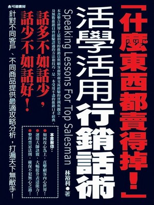在競爭激烈的社會中,推銷口才及良好的溝通能力,是成功的關鍵因素。你正受困於失意的職場,因無訂單而心煩氣燥嗎?你渴望挑戰沈悶的生活,給自己一片新天地嗎?你想提高自己的口才嗎?本書讓你面對任何場合均能靈活反應、從容自若;讓你找到人生目標,讓你夢想成真!