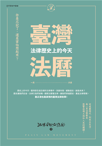 地球不停地公轉,時間無情地前行,本應毫無關聯的事件,偶然交疊於「同一天」,使我們得以回首「過去」,進而對「現在」的一切看得更加透徹,然後嘗試掌握未來。透過「歷史上的今天」,我們得以回顧曾經發生在臺灣這塊土地上的事,而這些事件發生在我們周遭,片片積累成為我們現在的臺灣,我們卻極其健忘,總要幾近失去才要記取教訓,法律白話文運動希望這個計畫以及這本書能夠用力為大家保存記憶,更希望讀者能透過這本書了解法律其實時時刻刻就在我們身邊。