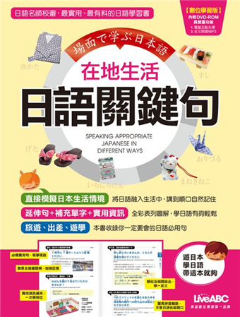 《在地生活日語關鍵句》收集了大量國人去﹙在﹚日本可能會需要到的生活用語。無論赴日的目的是觀光旅遊或是出差遊學,書中的句子你一定都會用的到。我們希望讓各位讀者學起來不只是輕鬆,更能增加使用上的便利性。除了實用句之外,書中也會收錄了在日本生活的重要須知與文化風情,希望藉由多元化的角度觀察,能讓讀者們能更深入瞭解日文用語的意思與異趣。