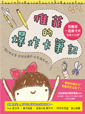 這本書以爆炸卡及可以放入爆炸卡的機關卡片為主。跟著本書,可以完成一個層層驚喜、滿滿心意的爆炸卡!假設爆炸卡的範例為13X13X13公分,但其實也可以代入不同的數字,做出符合自己需求的卡片。每款卡片也會附上QR code,掃描後能連結教學影片,或是可以參考「雅菲的生活創意卡片」或「雅菲的創意機關卡片」這兩本書,內有更詳細的教學步驟。希望這三本書能幫大家打破層層做卡片的迷霧,更開心的玩手作!