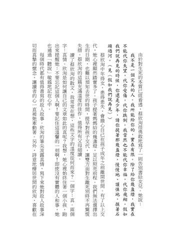 蔡欣洵中年得女,患得患失,會擔心自己在孩子成年之前離開世間。有了以上交代,她心裡顯然踏實多了。孩子提著媽媽給的幾盞燈,足以照亮前程。我們無法選擇出生的日期,也難以預知去世的時間,提早對孩子交代,讓雙方面對生離死別時不再驚慌失措。蔡欣洵的這篇充滿溫度的佳作,值得所有父母細讀。