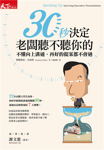 名人推薦:「這本《30秒決定老闆聽不聽你的》,正可說是市場上諸多簡報書中,針對高階溝通這個死穴的最佳解藥。」