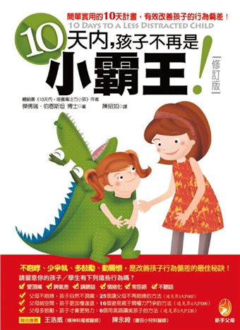 在《10天內,孩子不再是小霸王》這本書中,家庭與兒童心理專家傑佛瑞.伯恩斯坦博士提出一套石破天驚的十天計畫,能幫你重新掌控行為偏差的孩子或青少年,包括那些患有反抗性偏差障礙的孩子。對每位沮喪的父母來說,這本非常有用且簡易可學的書,解釋了什麼原因造成孩子的偏差,以及你該如何轉換自己的行為,而不用再大聲咆哮。按部就班,每天只要花幾分鐘的時間,透過以下的秘訣,就可以改善你們的親子關係。