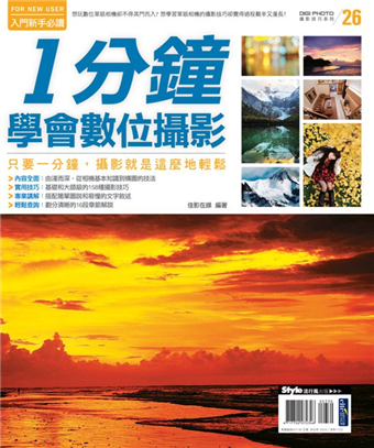 本書匯集眾多攝影師的拍攝經驗,透過精闢簡練的文字,搭配賞心悅目的圖片,從最基礎的攝影器材和攝影基礎知識著手,針對各種不同題材的攝影表現技巧以及用光技法進行介紹。內容全面而細緻,並以一頁內含2種技法知識,即使是新手也僅需花費短短的一分鐘,便能迅速找到並掌握所需的專業攝影知識與技巧,拍出完美照片。