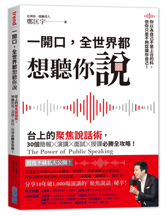 認識鄭匡宇老師,是在2009年一場跟好友一同舉辦的「益讀讀書會」上,就像匡宇在本書「成為專業講者篇」中的內容,當年的我們只要有人邀請,就一定會前去參與配合,無論獎酬多少都無所謂,一有機會就努力把握,藉此累積自己的實戰經驗與人氣。這段期間我與匡宇也一直保持聯繫,不時相約吃飯,聊聊彼此的近況與工作。今年匡宇寫了這本專業的表達力書籍《一開口,全世界都想聽你說》,分享了他一路走向成功的方式與過程中的失敗經驗,並分為「上台準備篇」、「台上功夫篇」、「走下舞台篇」以及「成為專業講者篇」!就連製造舞台(自造舞台)的撇步與「助理小陳」的妙招等只有他自己知道的事情……全都不藏私地收錄在這本書裡。除了專業有用的內容之外,還多了許多激勵人心的小故事,非常值得各位拜讀、學習,一起朝「一開口,全世界都想聽你說」的目標邁進!