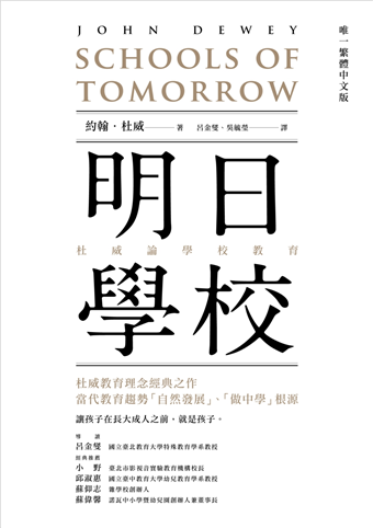翻看《明日學校》的內容時,杜威所提倡的「教育即生活」是大多數教育者耳熟能詳的名詞。書中提及許多學校教學模式,詳細的說明了如何在學校教育裡,實踐「教育即生活」的理念,其中提及了許多教育一直存在的錯誤目的,至今也未曾消失。站在2018年的此刻,在翻看百年前教育理念的同時,突然連結起1915年此書的出版,正值第一次世界大戰的混亂年代,在硝煙四起的戰亂時代裡,在百年前的生存模式下,杜威對教育的見解和分析,足以稱之為「先知」。~~蘇偉馨/諾瓦中小學暨幼兒園創辦人兼董事長