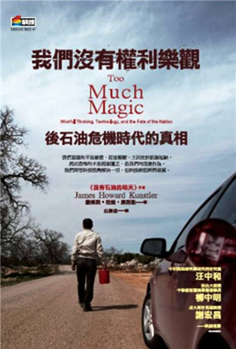 繼 The Long Emergency: Surviving the Converging Catastrophes of the 21st Century(中譯《沒有石油的明天》)這本暢銷書之後,被《出版人週刊》(Publishers Weekly)稱為「都市虻」(urban gadfly)的社會評論和小說作家詹姆斯.哈維.康斯勒又完成了 Too Much Magic: Wishful Thinking, Technology, and the Fate of the Nation(中譯《我們沒有權利樂觀:後石油危機時代的真相》)。這兩本書,如果再加上作者於一九九四年所出版的 The Geography of Nowhere: The Rise and Decline of America’s Man-made Landscape,剛好構成美國社會的有心人士對於國家發展(都市化與空間、政治、經濟)、能源危機、氣候變遷以及科技發明的綜合論述三部曲。