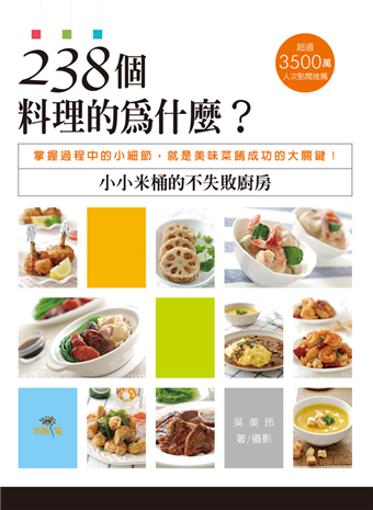 「238個料理的為什麼?小小米桶的不失敗廚房」每道都有材料、做法,更詳細列出料理份量、關鍵的重點、注意Note,還有小米桶的貼心建議,讓您100%精準掌握所有步驟,美味料理大成功!更依菜式分為:<Part 1>豬、牛、雞肉美味更加分的83個關鍵重點---包括:全雞、雞腿、肉絲、雞塊、豬腳、五花肉塊、排骨、牛腱、牛腩、絞肉…等不同部位的關鍵重點,輕鬆變化應用23道菜餚。<Part 2>海鮮、蛋、豆腐鮮嫩嫩上桌的77個必學技巧---包括:全魚、魚片、魚塊、蝦仁、蝦球、蝦泥、蛤蜊、蚵仔、螃蟹、透抽、蒸蛋、蛋皮、豆腐…等,不同種類處理的必學技巧,實際應用28道菜餚。<Part 3>蔬菜、飯麵、湯輕鬆零失敗的78個精準訣竅---包括:菠菜、絲瓜、茄子、苦瓜、小黃瓜、番茄、芋頭、蓮藕、乾香菇、煲飯、炒飯、粥、蛋包飯、米粉、麵線、麵條、麵團、濃湯、羹湯、煲湯…等,各種實用的精準訣竅,應用變化24道菜餚。