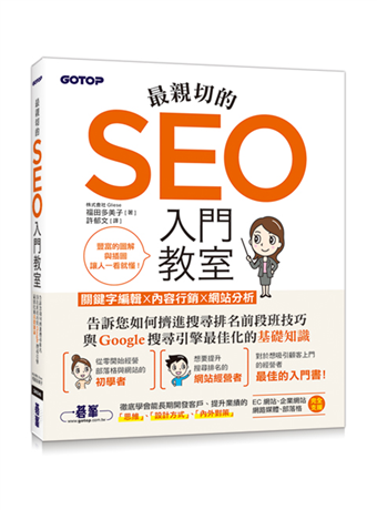本書是專為想要學習SEO基礎知識,希望自己的網站能出現在搜尋結果前段班的人所撰寫的書籍。藉由本書豐富的圖解以及生動的對話設計,即使在此之前您連搜尋引擎最佳化都沒有聽說過,也能藉由本書快速學到相關的基礎知識與概念。