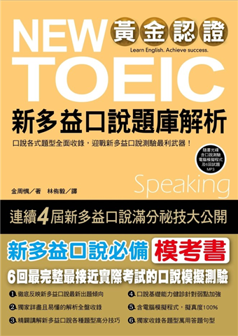6回口說模擬試題,考前密集訓練首選! 明明英文的聽力、閱讀能力差不多,年資、績效也相當,為何外派、受訓、升遷的機會總是輪不到自己?與其抱怨主管偏心,制度不公,更重要的是加強自己的英文口說能力,讓自己遇到需要大量英語的國際商務場合時,不至於左支右絀。公司知道將你外派時不會因溝通不良而影響商機,派你受訓時不會因無法討論、提問而影響受訓成效,自然會給予更多外派、受訓的機會,升遷的管道也就自然更加通暢!再者,隨著社會競爭越來越高,熱衷新多益聽力、閱讀考試的人越來越多,使得在新多益聽力、閱讀測驗上獲得高分的人也增加不少,要比別人更出眾,獲致更多的成功機會,你更需要新多益口說測驗成績單的加持。
