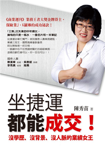 但是,除了這些業績、獎金、獎項、頭銜之外,最重要的是我證明了我自己──陳秀苗,一個中年失業的「三無」婦女,當初想做保險卻被保險業務員嗤之以鼻、看不起的「咖小」,沒有任何做業務的條件,只因為沒有退路,只因為要一份補貼家用的收入,於是憑著一股不放棄的執著,在捷運硬著頭皮進行所謂的「陌生開發」,終於從「咖小」變成「角色」,有了出頭的一天!