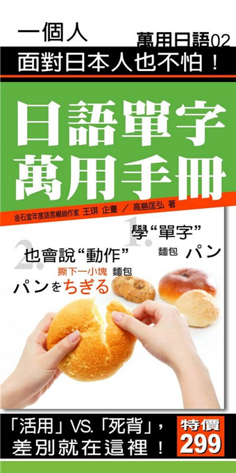 上市三周即名列「金石堂非文學類排行榜第四名」的「生活單字萬用手冊」,推出日文版「日語單字萬用手冊」。日文版由暢銷作家王琪企畫,並邀請優良教師獎得主高島匡弘先生撰寫日文。全書內容簡述如下; ★厚實的528頁,包含42大類、500個主題單字、以及6000種延伸用法。 ★本書的42大類單字,都是生活中十分熟悉、經常接觸的事物。包含;食物、各式零嘴、冰品&飲料、調味醬料、餐具、便利商店、衣物、交通設施、電腦周邊、大自然、金融事物、休閒娛樂…等。 ★再由42大類延伸出「主題單字」。例如;「食物」這一大類便延伸出水果、蔬菜、肉類、魚肉、海鮮、蛋、麵條…等「主題單字」。 ★每一個「主題單字」都包含兩種學習元素; 1。學「單字」 2。也會說「動作」