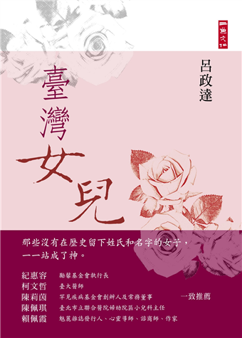 過去醫界流傳著一個冷笑話,某個車禍受傷的少年郎,阿公阿嬤在急診室焦慮的等候,嘴巴直嚷嚷,醫生怎麼還沒來,冷不防一個瘦弱的女醫師從旁冒出一句,我就是醫師啊,我已經來很久了。早期臺灣的女兒,除非未婚,否則終生只能以夫家的天為天,以丈夫、子女的成就為成就,期待呂老師的書對臺灣女人的自我意識能有提升的作用,讓臺灣的女兒在歷史上不再全無名字,讓臺灣的女人不再只有留下某氏(通常是夫姓)、某夫人或某太夫人而已。
