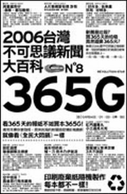在籌備本書期間,某天在網路上發現,遠在美國紐約有個年輕人,從事廣告工作之餘,每天在街頭收集有意義、紀念性之垃圾(像是時代廣場的跨年紙屑花;洋基球場門票……等),經過設計、包裝後上網販售,沒想到廣受世界各國消費者的歡迎。當初看到這個網站時相當開心與興奮。藝術設計,包括出版等文化創意產業,在新的時代,藉由不同形式,慢慢地與許多社會議題,像是環保意識開始結合。這本書對自轉星球來說,最大的意義乃在於它的出發點,是從「資源回收」開始,配報報紙新聞主題,再結合設計、出版專業技術,最終,讓本書變成一種接近行動藝術創作的書籍,讓《365G》不單單只是一本書而已。