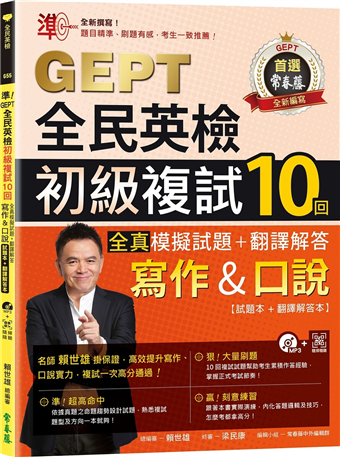 有鑑於寫作與口說常是考生最害怕的測驗類型,我們集結中外編輯群,經多次研擬並網羅各類新鮮題材,終於完成這本全新編寫、仿真度極高的《準!GEPT全民英檢初級複試 10 回全真模擬試題 + 翻譯解答》,希望藉由反覆練習培養考生的作答能力與經驗,真正上戰場時能夠從容不迫、輕鬆應戰。