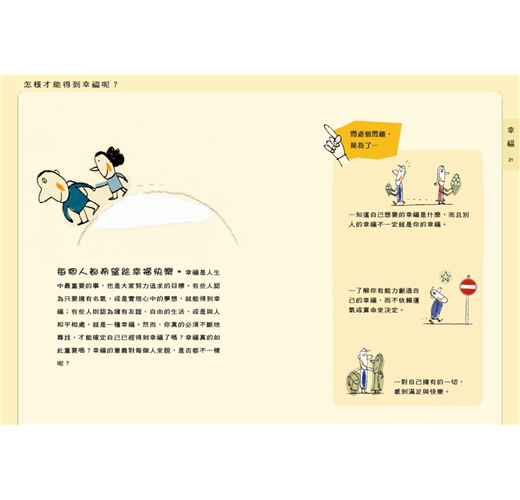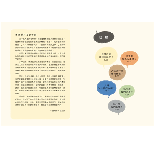 精彩書摘(一)人類存在,這是個確定的事實。不過,有時候我們還是會停下腳步,驚訝地看著自己,思考關於人類存在的問題。人類的存在真的有意義嗎?究竟是神還是大自然創造了我們?如果地球上沒有人類的話,會不會比較好?精彩書摘(二)Q:你想要成為冠軍嗎?(願望)A:要,因為我想成名,還想要上電視。嗯,可是…上電視的人就比看電視的人優秀嗎?你到底是你想要出名,還是想要成為冠軍?如果有一天冠軍不再上電視,那他會做什麼?Q:為什麼生命會有痛苦?(痛苦)A:因為爸媽不了解我。嗯,可是…你曾經試著了解你的爸媽嗎?爸媽可能把每件事都做的很完美嗎?爸媽不了解你就表示他們不愛你嗎?Q:為什麼我們活著?(人生的意義)A:為了工作。嗯,可是…我們工作是為了生活…還是我們生活是為了工作呢?到底,工作的目的是什麼呢?如果我們不喜歡工作呢?如果我們不工作呢?