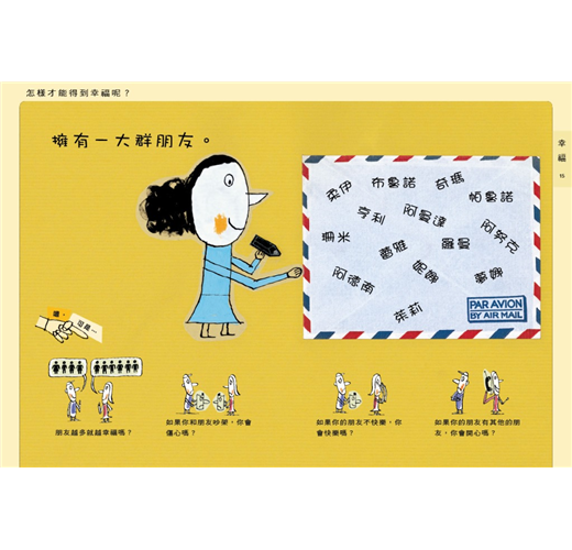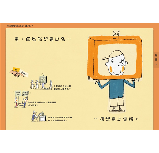 法國暢銷兒童哲學圖畫書,讓孩子在遊戲中思考,在遊戲中玩哲學!談戀愛好嗎?一定要上學嗎?幸福是什麼呢?為什麼人生會有痛苦呢?孩子從小就會提出這些問題,直到長大,在生活中我們也不斷思考這些問題,可是你從來沒發現…這些都是哲學!由法國繪本名家設計,不論在文字內容或視覺設計上都呈現絕佳的創意。你會發現書中所討論的概念,都是以「一問多答」的方式進行。目的是希望孩子透過反覆辯證的思考練習,和自己進行邏輯性的對話,找到「自己的」答案。在閱讀的過程中,先別急著回答,因為每個問題都提供了六個可能的思考方向,你可以自由選擇,換個角度想想,或者是化身為不同的角色,設想各種可能的答案,一旦開始加入「思考」這場遊戲,你會發現,對事情的看法將變的更有創意與想像力!(目錄)1.怎樣才能得到幸福呢?(幸福)2.你想要成為冠軍嗎?(願望)3.人生為什麼會有痛苦?(痛苦)4.人類為什麼存在?(存在)5.為什麼我們活著?(人生的意義)6.為什麼我們會死?(死亡)