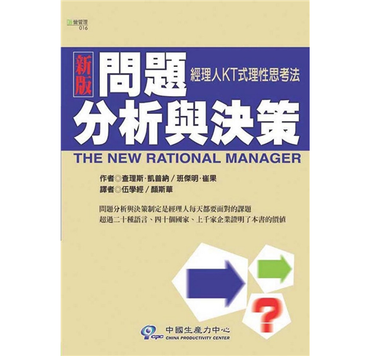 1980年,凱普納和崔果博士開創出劃時代的「問題分析與決策制定程序」,並創立知名的KT公司,將理性分析與邏輯思考的決策方法發揮到極緻,全球已有五十個辨事處。二十年來,這套方法幫助過上千家公司,並証明它適用各種商業環境,更能改善個人日常生活,在超過四十個國家,用二十種語言證明了它的價值。本書是這兩位國際級管理顧問的心血結晶,甫一出版即暢銷全球,以簡明易懂的真實案例,用抽絲剝繭的手法,詳細解說問題解決與決策作成的技巧與原則,能幫助您避開風險,發掘正確方向。本書已再版多次,全世界已有數百萬經理人受惠。修訂版運用了前一版清晰又詳盡地說明問題解決與決策制定程序,將其重新修編,再加上從前一版出版以來所收集的案例。其中在觀念的解釋上,更利用我們所學到的—如何對不同專業背景及紀律的人更精準地描述程序。同時對程序(Processes)本身提供了一些稍微不同的解釋,這樣的做法是歸根於過去,凱普納‧崔果公司運用這套方法幫助世界各地客戶如何在不同的組織設定中所施行的經驗。