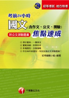 國文這一科的成績對考試成績有著舉足輕重的地位。然而範圍既廣,準備起來又十分不容易,考生往往望而興嘆,不知從何下手。本書特別針對考生困難,利用考前時間抓住最重點速讀,以求在短時間內盡力爭取高分。內容分為作文、公文、測驗三個部分,各章均分為兩單元:(一)滿分寶典:針對「考試焦點」與「作答方法」,作重點濃縮,使考生能在考前的最後關鍵時刻,快速閱讀及記憶,並輕鬆抓到考試重點。(二)實戰演練:精選相關歷屆試題,作有系統的編排,並詳細分析擬答,使考生能在試題演練中,增強應試實力。針對最新考情,特別新增第四部分:實力進階—公文測驗題庫,簡明清晰的公文相關測驗題,抓準考點、讓您掌握最新考情,從做中學,全盤了解公文製作與收發的公務員先備知識!第五部分為最新試題及解析,讓您了解近年出題動向,從而獲取高分。本書是考前最後衝刺必備的書籍,熟讀本書「滿分寶典」,並不斷地重複練習「實戰演練」,必能讓您在考場所向披靡!