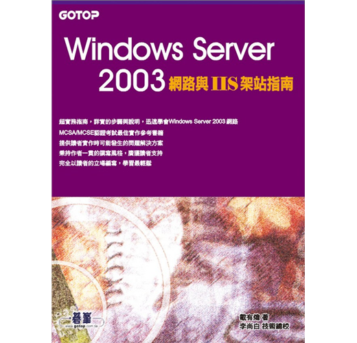 1.超實務指南,詳實的步驟與說明,迅速學會WindowsServer20032.MCSA/MCSE認證考試最佳實作參考書籍3.完全以讀者的立場編寫,學習最輕鬆4.考慮到讀者實作時可能發生的問題,並提供解決的方法5.秉持作者一貫的撰寫風格,長久以來廣獲讀者支持6.DHCP、WINS、DNS7.PKI、電子郵件安全性、IPSec8.遠端存取、VPN、RADIUS、路由器9.NAT、基本防火牆、終端機伺服器10.IIS網站、SSL安全連線11.FTP伺服器、電子郵件伺服器、NNTP伺服器12.遠端安裝、網路監視器