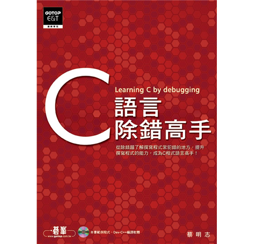 從除錯題目了解撰寫程式常犯錯的地方,提升撰寫程式的能力,成為C程式語言高手!親手debug,是學習程式語言的最佳方法,這是所謂的除錯學習法(Learningbydebugging),此方法一來可得知撰寫程式時常出錯的地方,二來可增加除錯的技巧,並加強自信心。.從除錯題目了解撰寫程式常犯錯的地方.親自除錯可提升撰寫程式的能力.以除錯題和練習題,測試您對每一小節的了解程度.以問題演練和程式實作,測試您對每一章的了解程度.是您成為C程式語言除錯高手的最佳途徑