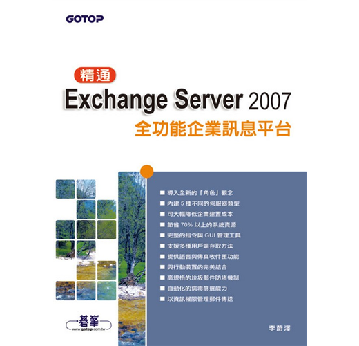 ‧導入全新的「角色」觀念‧內建5種不同的伺服器類型‧可大幅降低企業建置成本‧節省70%以上的系統資源‧完整的指令與GUI管理工具‧支援多種用戶端存取方法‧提供語音與傳真收件匣功能‧與行動裝置的完美結合‧高規格的垃圾郵件防堵機制‧自動化的病毒篩選能力‧以資訊權限管理郵件傳送ExchangeServer2007是一款全新的企業訊息平台,它以往給人的印象無非就是Windows系統中的郵件伺服器,其實郵件系統只是ExchangeServer眾多功能之一。在與WindowsServer2003中的ActiveDirectory和IIS6.0相互搭配下,除了提供絕佳的穩定性外,更可擴充企業網路服務的範圍,以達到用戶端的全方位支援。本書除了介紹ExchangeServer基本的郵件功能外,更鉅細靡遺的說明了在ExchangeServer2007中加入的新技術,同時為了使每位讀者能完全融會貫通,因此在各個章節的開始,均先說明相關原理基礎,接著再輔以實際的操作。其主要的目的是希望每位讀者在最短的時間內,都可輕易完成Exchange伺服器的建置工作,所以在撰寫時捨棄了一般書籍龐雜的內容,取而代之的是核心部份的掌握。