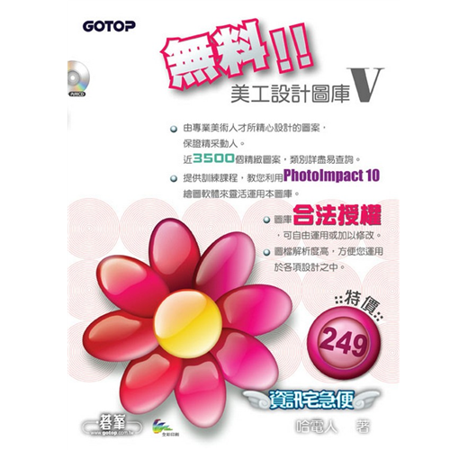 因為電腦的普及,許多的學生、商業人士、辦公室人員,都能透過各種的應用軟體來完成文書處理、簡報說明、電子卡片、海報宣傳、網頁設計…,而不需要事事都要交由專業的美術設計人員才能做到,只有在插圖方面的取得方面往往造成許多困擾。因此,分類詳盡、類別眾多、圖案精美、解析度高的圖庫就成為必備資料。本書以縮圖方式呈現圖庫中的所有圖案,便於查詢,也方便您在購買本書時,就可現場看到所有的圖庫內容,不怕買回家後有受騙上當的感覺。此外,書中也提供有範例與教學說明,讓您輕鬆就能利用圖庫來作出想要的作品。‥由專業美術人才所精心設計的圖案,保證精采動人。近3500個精緻圖案,類別詳盡易查詢。‥提供訓練課程,教您利用PhotoImpact10繪圖軟體來靈活運用本圖庫。‥圖庫合法授權,可自由運用或加以修改。‥圖檔高解度高,方便您運用於各項設計之中。