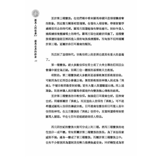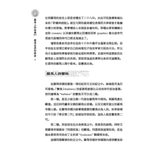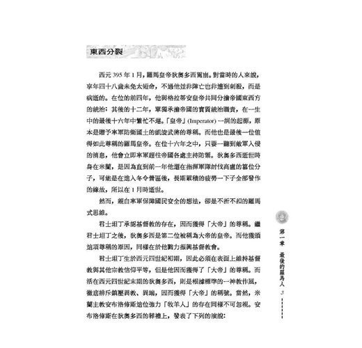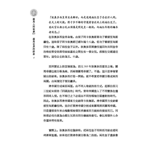 羅馬帝國的尾聲,從帝國真正的分裂開始。兄弟之邦無法發揮手足之情,互相牽絆、角力,算計著自身難保的困境,東西兩帝國走上不同的道路。在西方,蠻族鳩佔鵲巢,他們的精神與文化,比羅馬人更像羅馬人,「最後的羅馬人」不是別人,是蠻族!在東方,沾染東方專制宮廷的氣息,宦官、皇后才是國家的主人,暮氣沉沉。