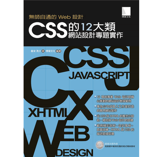 本書因應Web設計而生,在書中我們將焦點放在最重要的兩種語言上,即XHTML與CSS,並融合了目前最新與最常用的技法於12種不同類型的教學範例中,透過閱讀與實機操作,讓您可以輕鬆地學得Web設計的精華。這12類範例包含了多種類型導覽、Flash影片嵌入、留言板製作、印刷樣式設定、行動電話專屬畫面等設計,都是取自實務上的需求與應用,讀者可以修改套用在個人的網站上。