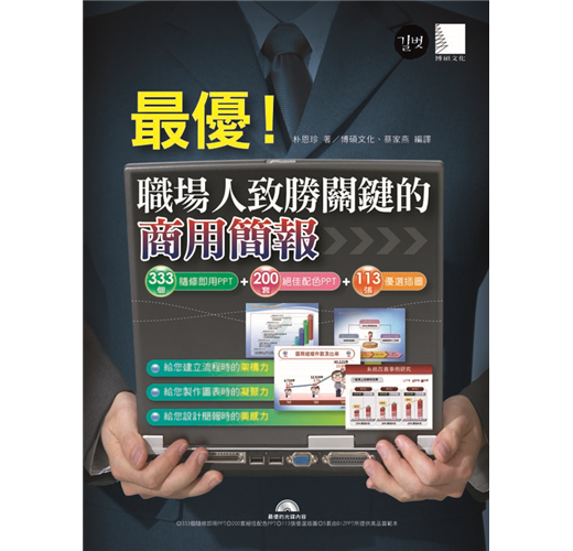 隨附光碟內含333個隨修即用的簡報設計檔,讀者不但可以從完成檔進行修調,也能從各階段操作步驟的子檔中修改成符合自我需求的商用簡報。另外,200套絕佳配色的簡報檔及優選商務插圖,更能讓您的商用簡報多元且專業化。
