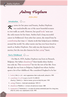 這位主演過《羅馬假期》、《第凡內早餐》、《窈窕淑女》等經典影片的知名女演員,早已是大家公認的氣質美女,人氣之旺自不待說,不僅歐美觀眾對她知之甚詳,日本、台灣等地的民眾對她也很耳熟。奧黛麗著名的不僅是她的美貌,她息影後積極參與公益事業,亦為人津津樂道。本文述說赫本的成長經歷,敘述一個本來一心只想做芭蕾舞者的女孩,是如何陰錯陽差走上了演戲這條路,其間又如何經歷種種波折,終於成為知名女星,為我們在影壇上留下不少美麗的倩影。