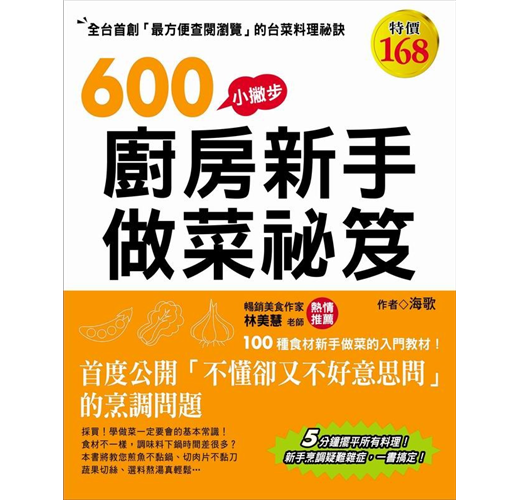 <廚房新手做菜祕笈>一書,依照烹調新手的需求,一共分為「醬汁調味篇、飯粥篇、蔬果篇、肉類篇、熬湯篇、素食篇及廚房收納篇」…等七大篇,可說是目前坊間「分類最清楚、搜尋最簡單、做法最易學」的料理小百科。