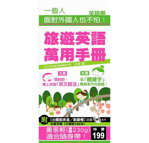 1。書很輕,和手機一樣輕盈的250g,適合隨身帶! 出國旅遊行李一堆,真不想再帶一本厚重的書籍增加自己的負擔!本書特別用質輕的紙張,整本書288頁,書體重量卻只有250g,幾乎跟手機一樣輕盈,出國旅遊攜帶完全沒負擔!2。全書包含9大情境,117個主題,1700個常用句。 (1)本書共分為9大情境,都是旅行時我們常會遇到的狀況。包含;登機前、飛機上、下飛機、住飯店、到處玩、交通工具、買東西、吃東西、幫幫我。 (2)再由9大情境延伸出「117個主題」,例如;「買東西」這個情境下有「哪裡買得到∕哪裡製造的、能退換嗎∕能測試嗎、問價錢∕折扣後多少錢、一般的殺價、用盡辦法,只為殺價、結帳…等各種主題。每個主題包含15個常用句,全書總共約1700個句子。3。【雙重功能】旅遊英語; 「左頁」-想說的,馬上找到「英文說法」! 「右頁」-猜到老外在說啥! 「能說能聽懂」是出國旅遊時,與老外溝通的重要關鍵。本書兼具「能表達」與「能聽懂」兩種功能,為求閱讀的便利性,全書內文將單一主題分為左右兩頁對應。 。以本書「主題91-結帳」為例; 左頁~「結帳」時你可能會用到的常用句; 只能用現金嗎?Doyouonlytakecash? 可以刷卡嗎?CanIusecreditcard? 這些總共多少錢?Howmucharetheseintotal? 不是有特價嗎?Don’tyouhaveaspecialdiscount? 右頁~結帳時「你可能聽到外國人說…」的常用句; 對不起,我們只接受現金付費。Sorry,weonlytakecash。 我們接受刷卡。Wetakecreditcards。 總共是二千元。Thetotalamountistwothousanddollars。 不好意思,您的信用卡被拒絕。Sorry,butyourcreditcardwasturneddown。4。【左頁】從「左側標籤」,馬上找到「英文說法」! 情況緊急時,如何從一堆句子中,快速找到自己想說的那句話?本書特別在「左頁」加上「左側標籤」,從句中挑關鍵字做成「左側標籤」,讓讀者藉由「左側標籤」的索引,更快找到自己要說的那句話。 。以本書「主題51-請人幫忙拍照」為例; 從標籤「幫我拍照」可以馬上找到→「請幫我拍張照。」Pleasetakeapictureofme。 從標籤「再拍一張」可以馬上找到→「可以幫我再拍一張嗎?」Couldyoutakethepictureofmeagain?5。【右頁】從「紅色關鍵字」,猜到老外在說啥! 出國旅遊與老外溝通一定會聽到英文,但是要怎樣聽懂老外在說啥?本書特別標示「紅色關鍵字」,一旦聽懂「紅色關鍵字」,等於掌握整句話85%的意義,老外在說啥馬上就知道。 。以本書「主題51-請人幫忙拍照」為例; Doyouwantthepeopletotakeupmostofthepicture? 〔紅色關鍵字的意義〕人要拍大…? 〔整句的意義〕人要拍大一點嗎?6。短句下方加註單字、音標及解釋,不用查字典也能看懂句子! 例如; 你好,我要訂機票。 Hello,Iwouldliketobookaplaneticket。 動book[(kk音標)]訂 名單planeticket[(kk音標)][(kk音標)]機票 book在句中當【動詞~現在式】 planeticket在句中當【名詞~單數】7。附【出國能表達∕能聽懂】試聽CD1片!本CD獨家錄製3種英文速度; 1。【分段】慢速度 2。【整句】慢速度 3。老外的【口語速度】 聽完只有一個結論;沒想到老外說的英文,我可以聽得這麼清楚! 想說一口標準的英文讓老外佩服,想更快聽懂老外在說啥,搭配CD學習,效果加倍! 「試聽CD」僅含部分內容,本書另有出版『旅遊英語萬用手冊-出國能表達∕能聽懂【光碟版12CD】』(收錄全書全部內容,定價799元)。