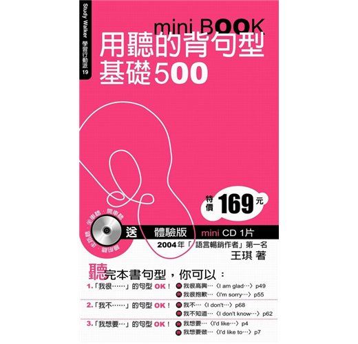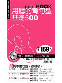 ☆體驗版miniCD僅含部分內容!另售;用聽的背句型-基礎500【光碟完整版CD1-7】(定價399元)(1)附贈【體驗版miniCD1片】,背句型像聽音樂一樣輕鬆!體驗版miniCD收錄;「句型1-4」。CD內容錄製詳細,不看書就能輕鬆背句型及短句。隨時隨地皆可學,時間、地點、姿勢自由選,開車聽、坐車聽、走路聽、睡前聽,透過反覆聽讀訓練,日後聽到外國人講英文時能更快理解,保證【背句型+訓練聽力】同步實現!。CD錄音方式Step1;聽【基本句型】→聽【句型公式】→聽【句型解說】Step2;聽【例句練習】1。唸【例句1】2。分段唸【例句1】一段中文一段英文3。拼讀【例句1】單字4。再唸一次【練習1】一句中文一句英文→【聽】下一個例句練習(2)【句型例句分解&單字詳解&常用語提示】例句分段學習,例句單字詳細拼讀,學句型同時背單字,不用另外查字典。(3)光碟特別收錄【句型使用解說】,猶如隨身小老師!每個句型都有詳細使用說明,搭配例句練習,學句型更有效率。(4)【巴掌大的小書,方便攜帶】越來越多人利用通勤時間自修,不過,隨身戴著一本厚重的書,長時間下來難免覺得累贅,本書體貼讀者,特意做成巴掌大小,輕薄短小,可用單手輕鬆拿,又便於攜帶與收納,最適合喜歡走到哪兒學到哪兒的讀者!