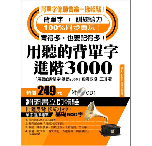 【用聽的背單字進階3000】收錄高中程度的3000單字,並延續【用聽的背單字基礎2000】著重於聽力學習的方法,CD收錄單字發音、拼讀及中文解釋,打破背單字一定要看書的傳統,保證〔背單字+訓練聽力〕同步實現。完全不受限的學習方式,時間、地點、姿勢自由選,即使開車、做家事也能背單字!☆本書只含CD1,另售《用聽的背單字進階3000(光碟完整版9CD)》(1)附體驗版CD1,背單字像聽音樂一樣輕鬆體驗版CD1收錄A、B開頭的單字。錄音內容;「唸單字」→「單字拼讀」→「慢速度唸單字」→「中文解釋」,不看書就能輕鬆背單字!(2)附【隨身背快記小抄】(收錄「用聽的背單字基礎2000」基礎500字)可隨身攜帶的輕薄小抄,作者歸納相同的發音原則,背進階單字,更可以同時背基礎單字,背單字更容易。(3)整理【字母同=發音同】單字群組,背單字不必死記音標
