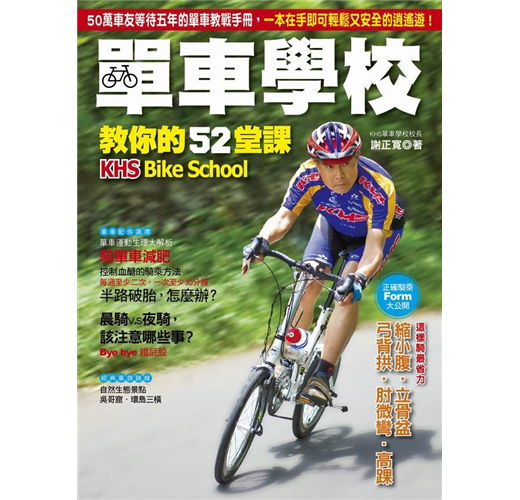 【推薦序一】尋找安全、放鬆、淋漓的自行車樂趣商業周刊社長俞國定我又開始騎腳踏車了,距離我上一次騎腳踏車是35年後的事。最近買了兩部小摺T3,從沿著我家的河邊開始,展開我的自行車探險之旅。記得我的第一次自行車探險之旅是40年前我的姨丈季友三先生帶著當時小學五年級的我,從彰化縣田中騎到斗六去買花生糖,來回50公里,沿路輕風、稻香、樹蔭、知了聲的記憶真是美好。40年後我又開始我的自行車探險之旅,當我沿著河邊開始往前踏行時,迎面的微風、稻田被太陽曬出的特殊香味、知了的叫聲,40年前美好的回憶又回來了。隨著我的自行車的路程逐漸加長,某一天從台北故宮順著雙溪,沿著基隆河一路騎到關渡,從關渡回來的路上,40年前美好的記憶卻轉化成跨下如火灼熱的的感覺,被遺忘的記憶缺口又浮現。由於沒有正確的裝備及技術,回程卻成了痛苦的堅持,美好的樂趣被屁股燒檔,雙腿酸麻的痛苦取代。原來長途騎乘自行車是有技術含量的,不是匹夫之勇就足以成事。當我知道謝正寬董事長的單車學校免費教導自行車愛好者騎乘自行車正確的觀念及技術,於是我前往參加曲道班,接受專家教練調教。據說,校長的飛輪班每次在網路上開始招生,四小時內就額滿。很多的單車愛好者也許不如我這般幸運,能參加謝董事長(我們都稱呼謝校長)的課程,但是在這本單車學校52堂課這本書中,您可以學習到完整的單車技術。謝校長將自己長期推廣自行車教育的經驗和心得精華融入這本書中,您不必專程前往桃園蘆竹鄉的單車學校,就可以方便地學習到自行車正確的騎乘姿勢、如何解決半路破胎、如何購買適當的坐墊、如何選擇通風耐磨的單車服,共計52堂,滿滿的內容夠我們用。謝校長教導我們安全、放鬆、淋漓的新自行車觀念,邀請大家追隨熱情的謝校長,找回對自行車的記憶、找回對大自然親近的新認識,讓我們大家一起踏著鐵馬相遇在台灣、在世界各地,享受安全、放鬆、淋漓的鐵馬樂趣。【推薦序二】幫助初學者,快速進入正確的騎乘領域財團法人自行車新文化基金會董事長(捷安特創始人)劉金標自行車既健康又環保,親子同樂又社會祥和,是最好的休閒運動項目,對社會也有許多正面效益,這是這波全球自行車熱潮最根本的原因。台灣市場從去年以來就非常熱絡,各廠牌的成車銷售供不應求,騎車人口大幅增加。不論作為運動休閒,或作為交通代步,騎車人口已經擴及社會菁英,騎車環島也從男性到女性,大家都在談騎車。這股風潮主要導自社會價值觀的改變,以前大家總是認為,自行車都是買不起汽機車的窮人所用的交通代步工具,當時自行車主要的功能是交通代步;而現在,自行車卻是休閒運動的良伴,騎自行車是高品味時尚生活的表徵;此外,政府和民間合作推動騎車風氣也是這波自行車熱潮的重要推手,改善台灣的自行車騎乘環境,並且積極推廣各項自行車騎車風氣,終於帶動了風潮。在騎車風潮興起之後,騎車的安全無疑是後續推動必須考量的重要推動項目。畢竟,讓所有車友能騎得安全、騎得有樂趣,是業者與消費者共同的願望。然而,現況是,部分業者忽略了產品的品質,或者沒有依據國家標準誤裝煞車器等安全設備,導致車友因為誤用而受到傷害;而部分車友也缺乏正確的安全騎車知識,沒有選對適當的產品、正確做好安全防護措施、正確地使用各項裝備、或者沒有依據相關交通法規騎乘,以致於造成傷害,或者無法真正享受騎車的樂趣,則都是十分遺憾的事情。功學社董事長謝正寬先生數十年來致力於經營自行車產業,「功學社」自行車在國內市場也是舉足輕重的品牌。除此之外,謝董事長自身也熱愛騎車,尤其難得的事,謝董事長為了建立騎乘單車「安全、正確、健康」的觀念,投身鑽研正確和安全的騎乘知識,並於八年前成立「KHS功學社單車學校」,宣導單車安全的重要性,推廣正確姿勢與技術,並帶動許多及騎乘活動,安排許多單車教學課程,而其本身也成為眾多車友口中的「謝校長」。謝董事長最近更將多年來的騎乘體驗和教學經驗,集結成冊,出版了《單車學校教你的52堂課》一書。本書是國內第一本專業圖解正確騎乘單車技巧與方法的全彩圖文書,書中針對騎單車的正確姿勢,包括如何縮小腹、立骨盆;上路之前該如何調整坐墊的位置,用什麼方式騎乘屁股才不會痛等等,不僅釐清一般人錯誤的騎車觀念,更解決所有車友的疑難雜症。本書的出版將有助於自行車初學者能很快進入正確的騎乘領域,並可協助部分車友改正長期不正確的騎車方法,從而使更多車友能正確騎車、安全騎車,真正享受騎車的樂趣,創造更健康和更快樂的人生。有鑑於此,特為序推薦之。