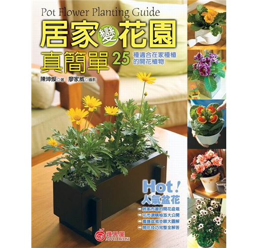 居家變花園真簡單:25種適合在家種植的開花植物推序1作者序Part1小盆花換心情一客廳裡的浪漫盆花二餐桌上的幸福盆花三角落邊的雅致盆花Part2栽種步驟大圖解一室內.窗邊開花植物非洲蓳火鶴花萬兩大岩桐中國水仙風信子報春花西洋杜鵑麗格秋海棠觀賞蘿蔔二陽台盆花瓜葉菊仙客來風鈴花愛情花瑪格麗特矮牽牛聖誕紅繡球花盆菊長壽花麒麟花非洲菊荷包花鬱金香螃蟹蘭Part3小觀念大學問一9關鍵,決定你家可不可Easy變花園!Point1植物,要選對Point2運送,要小心Point3回家,要檢查Point4 位置,要擺對Point5澆水,要恰當Point6 施肥,要勤快Point7 繁殖,看季節Point8 殘花,要整理Point9 病蟲,要留意二9樣工具,植栽必備不可少!1培養土2人工介質3長效肥料4開花肥料5澆水壼6噴水器7有洞盆具8鏟子9剪刀附錄全省花市一覽表