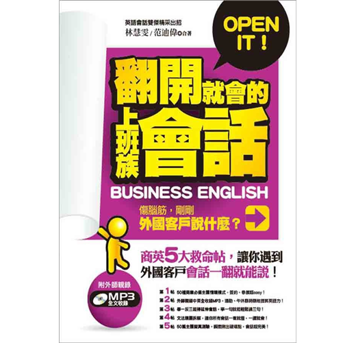 不管你在哪一個產業,全球化的趨勢下,你都得懂英語,才能站出去和全世界做生意;有沒有這樣的經驗,因為英語不好而與大訂單擦身而過?英語沒一句聽得懂,和老外對談只想逃跑?《翻開就會的上班族會話》抓出這種害怕心態,透過名師豐富經驗,規劃屬於上班族的學習方式:1. 超實用對話;2. 超好唸單字;3. 超好懂文法解析;4. 非知不可的觀念,讓你翻開書就開啟另一個世界,成功訂單簽下一張又一張!