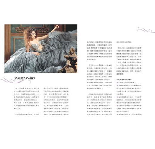 穿出動人的婚紗穿上白紗是每個女人一生的夢想,美麗的婚紗可以展現個人的獨特光芒,無論是美背式的設計,大膽裸露背部的性感曲線,或是優雅高貴的設計,配上浪漫的長頭紗、蕾絲手套,再拿束美麗清香的捧花,每個新娘都成為婚禮當天最美麗的天使。然而心目中的夢想婚紗,並非都是適合自己的。例如,肩膀寬的就不適合凹字型的胸前設計;臀部寬大的,就以選擇 A型或大 A A及蓬裙。專業婚紗設計(1)如肩膀比較圓的,適合無肩帶的禮服或白紗,可展現其美肩,因圓肩的人較不容易穿得住肩帶。(2)消瘦身型的新娘,適合穿上身設計感較多的禮服,才使得骨感有豐潤的修飾。(3)身型較為直筒、手臂較粗的新娘,可選擇有袖子而衣身較高腰的禮服,可顯消瘦纖長。但無論是何種婚紗或試禮服,當看到喜歡的婚紗樣式,都可以將資料收集後和專業的設計師討論,經由他們專業的角度給予妳最實際的參考。專業的婚紗設計師郭又菁指出,通常第一次與準新娘見面,她會將新人的缺點一一告知,讓她了解自己的身材,再讓她試婚紗。因為了解身材,才能在挑選婚紗時,依照個人的特點,突顯個人優勢,進而掩飾身材的缺點。那彷彿也像是為她量身訂做的婚紗一般,讓她穿上它時,因為擁有自信而更加地美麗動人。而搭配婚紗的飾品具有畫龍點睛的效果,其重要性不亞於選擇婚紗,因錯誤的飾品有很大的反效果。頭飾可分為長短頭紗、皇冠、髮窟、頭花等。璀璨亮眼的皇冠,襯托高貴的姿態。頭紗的選擇也會影響婚紗的感覺,長頭紗有著浪漫動人的公主氣息;短的頭紗,則適合俏皮甜美的新娘。除了白紗,在婚宴時還可以選擇中國古典味的禮服,夏姿‧陳以中國圖騰意象為緹花刺繡之設計主軸,諸如象徵富貴吉祥之牡丹水雲、四君子梅蘭竹菊等等,創新中國傳統手工技法,讓圖文活靈活現、栩栩如生。在堅持現代中國風格之際,加入西式面料與手工的運用,保留傳統卻又帶著時尚,也是一個很好的禮服選擇。