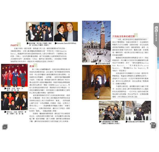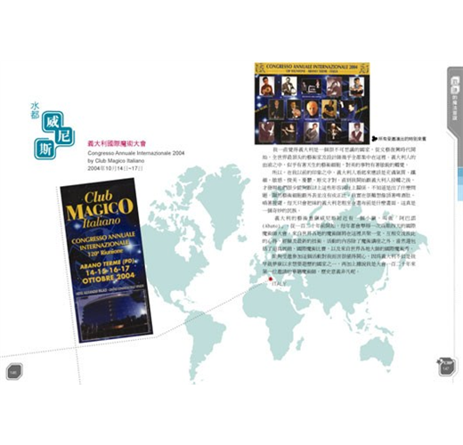 他細膩而優雅的動作,讓手上的每一樣物件都像是發出光芒,高超的手法,甚至讓魔術師們都嘆為觀止;而他搞笑的說話方式與肢體動作,讓我從頭到尾幾乎笑到窒息。他充分利用了自己的個人魅力,帶領著現場觀眾的情緒,讓每一個人都陶醉在歡樂及愉悅的情緒裡。人不可貌相啊!水都威尼斯義大利國際魔術大會 Congresso Annuale Internazionale2004by Club Magico Italiano2004年10月14日~17日我一直覺得義大利是一個很不可思議的國家,從文藝復興時代開始,全世界最頂尖的藝術家及設計師幾乎全都集中在這裡。義大利人的血液之中,似乎有著天生的藝術細胞,對美的事物有著敏銳的觸覺。世界上最傑出的服裝設計師像阿曼尼、凡塞斯等等都是義大利人,而世界上最好、最美的跑車像法拉利、藍寶基尼等等也是義大利設計的。所以,在我以前的印象之中,義大利人看起來應該是充滿氣質、纖細、敏感、俊美、憂鬱、斯文才對。直到我開始跟義大利人接觸之後,才發現他們很少能夠跟以上這些形容詞扯上關係,不知道是出了什麼問題,顯然藝術細胞跟外表並沒有成正比。我實在很難想像頂著啤酒肚、啃著披薩、每天只會把妹的義大利老粗坐在畫布前是什麼畫面。這真是一個奇妙的民族。義大利的藝術重鎮威尼斯附近有一個小鎮,叫做「阿巴諾( Abano)」,從一百二十年前開始,每年都會舉辦一次為期四天的國際魔術師大會,來自世界各地的魔術師將在這裡共聚一堂,互相交流彼此的心得、經驗及最新的技術。活動的內容除了魔術講座之外,當然還包括了道具展銷、國際魔術比賽,以及來自世界各地大師的國際魔術秀。能夠受邀參加這個活動對我而言很值得開心,因為義大利不但是我早就夢寐以求想要遊歷的國家之一,再加上據說我是大會一百二十年來第一位邀請的華籍魔術師,歷史意義非凡呢。 P A R T Y在義大利的一個多星期,發現義大利人是一個很喜歡開 P A R T Y的民族。活動還沒開始,主辦人歐洲魔術商業聯盟主席「多明尼克‧丹提( Domeniko Dante)」就邀請所有的演出嘉賓到他的私人豪宅中開 P A R T Y。大會開始之後的第一天晚上,也有所謂的歡迎酒會。接下來每個晚上也都毫無例外的有各式各樣的 P A R T Y,直到最後一天為止。雖然每天都很開心,但我還是不禁懷疑他們每天的生活中,到底有多少時間是在認真工作的呀?表演第三天晚上的國際魔術秀,我被安排在開場表演(因為我的表演節奏快速,而且運用了很多刺激感官的特殊效果,所以很多魔術大會都喜歡將我安排在開場)。在後臺休息室準備時,一面準備,一面與其他的魔術師聊天說笑。年僅23歲,曾得過 F I S M世界大賽 G R A N D P R I X大獎(這是世界上最高的魔術獎項,相當於奧運金牌裡面挑選出來的金牌)的「傑森‧拉提瑪( Jason Latimer)」秀給大家看他道具箱的內部,裡面幾乎沒有什麼道具,全部是各種顏色的襯衫,原來他會在上臺前根據自己當時的心情決定襯衫的顏色,超特別的。當我覺得傑森的思考方式真是詭異的時候,看到另一位魔術師,來自大陸上海的魔術新秀劉明亞從道具箱拿出他從上海大老遠帶來的「雞蛋」,因為他擔心國外沒有「白色而橢圓」的雞蛋,因此一定要自己帶來才放心……。得過無數世界魔術大獎的「米爾可( Mirko)」,在換衣服的時候,露出自己浮現出一根根肋骨的「胸肌」,到處說要跟人單挑。我發現,魔術師的厲害程度,跟私底下的白痴程度成正比。這場表演狀況還算不錯,尤其是觀眾全都好像嗑了藥一般非常興奮,臺下口哨聲、歡呼聲及掌聲源源不斷,讓所有的表演者都充分感受到義大利人的熱情。只有船沒有車的威尼斯「水都」威尼斯是我所去過最特別的城市。從出了機場開始,我就沒看到車子,在這個城市移動的方式只以兩種,走路或坐船。而它也是我高度強烈推薦給大家的一個旅遊聖地,通常,出國旅遊有幾種不同的目的:觀賞古蹟、欣賞風景、購物等等,威尼斯正好是少數符合這三樣目的的最佳選擇。整個威尼斯最重要的景點都是大約十二世紀時建成的,所以觸目可及的許多壯麗建築物全都有近千年的歷史。其中,「聖馬克廣場( Basilica San Marco)」、「托卡雷皇宮( Pa;azzp Ducale)」、「嘆息橋( Pote Dei Sospiri)」等等地方,更是著名。在街道巷弄中有無數的大小店面,提供許多精緻商品,無論是名牌服飾(比臺灣便宜很多),當地的手工紀念品,以及許多風格特殊的藝術品,都可以在這裡找到。我在這裡逛了整整兩天,收穫非常豐富。不過要注意的是,通常觀光地的小偷扒手很多,走在街上或是人群中的時候要格外小心隨身的包包或貴重物品,一位日本友人就有在威尼斯現金被扒走的經驗。所以出門在外一定要提高警覺喔。(再次想起自己的切身之痛)與內田貴光( Utida Takamitsu)在這次的公演中,我除了表演前面提過的螢火蟲魔術之外,還有一段是跟日本的年輕職業魔術師,曾經獲得無數國際大獎的「內田貴光」合作表演一套稱為「紙牌操縱術( Card Manipulation)」的快速程序。魔術師在臺上用快速的手法從空中不斷抓出撲克牌,這樣的表演或許有很多人看過;但是雙人搭配演出,可就是從來沒有人嘗試過的事情。為了這套表演,在我到達日本之前的一個月,我們兩個人花費了難以想像的長途電話費,就為了討論及編排程序的細節。為了培養舞臺上的默契,我們甚至可以在電話之中聽著音樂彩排。我到達日本之後,兩個人花了兩天實