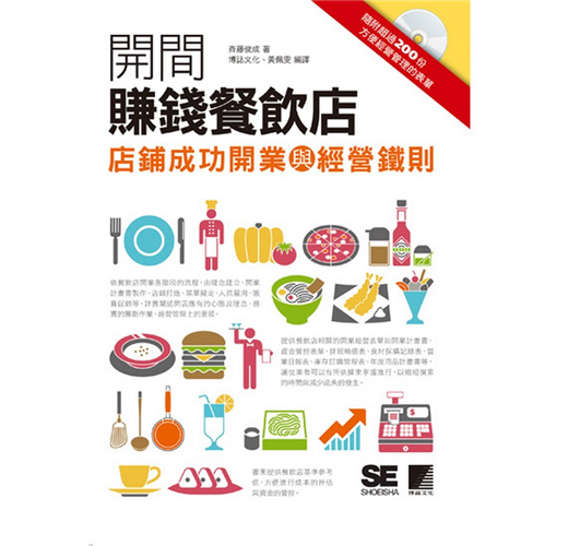 第1篇基礎知識第2篇開業2-1建立理念2-2製作開業計畫書2-3製作菜單2-4搜尋店鋪建物2-5打造店鋪2-6尋找交易往來業者2-7雇用員工2-8販賣促銷2-9營業前準備第3篇經營3-1提昇服務力3-2提昇商品力3-3培訓人才3-4收集顧客資訊3-5經營管理第4篇店鋪改善&第2家分店4-1重新檢視店鋪4-2改善店鋪4-3開第2家分店附錄依業種、業態別徹底分析餐飲店