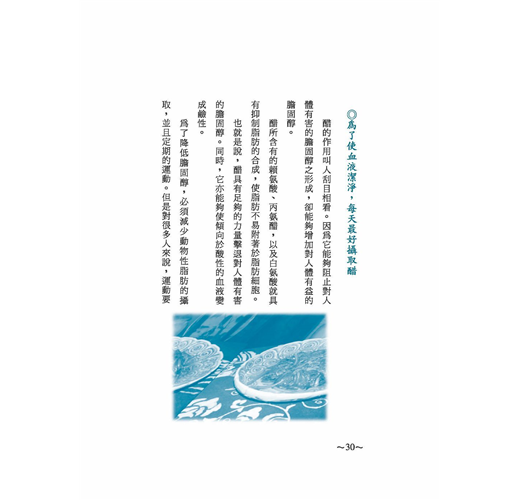 《本草綱目》記載:「醋可消腫痛、散水氣、理諸藥。」醋含有多種有機酸、氨基酸、糖類、維生素和豐富的有機鹽等,在防病、治病、養生等方面有極為廣泛的用途。