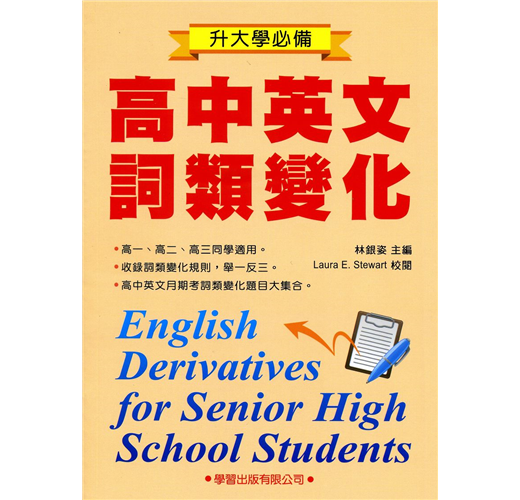 本書特從高中月期考試題中,整理出30回測驗題庫,每一回有10題,題目均附詳細註解及翻譯;補充詞類變化規則;字典式排列英文詞類變化,方便查閱。 是您應考的必備用書。
