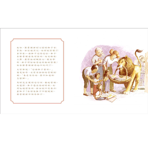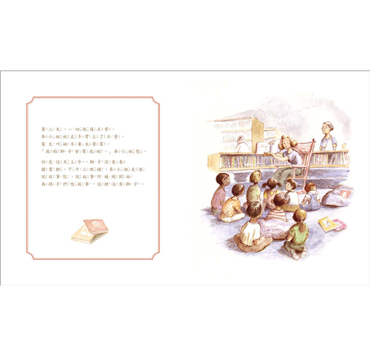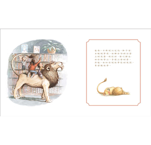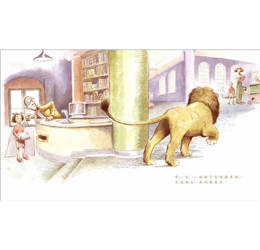 故事可能迷人,但是和大家一起聽故事、一起在圖書館裡過日子,或許才是獅子最想念的情懷與滋味吧。整本書的淡雅色調和作者描繪情感的方式一樣安靜,不太有情緒的敘述對照趣味十足、表情細膩的畫面,更讓人對細節印象深刻。像是孩子或騎或坐在獅子身上時,獅子臉上全然滿足的神情。這樣的神情說服我們:閱讀是一件在空間裡和人、和書發生情感的美事,就像圖書館的那頭獅子所感受到的一樣。