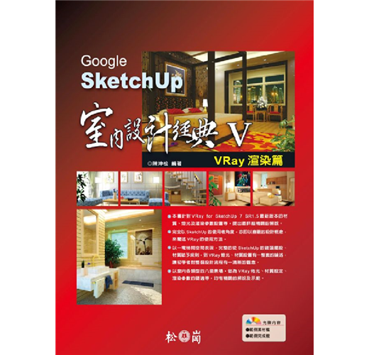 特別收錄 / 編輯的話:本書針對VRayforSketchUp7SR1.5最新版本的材質、燈光及渲染參數設定等,提出最詳細精闢的解說。完全以SketchUp的使用者角度,亦即以直觀的設計概念,來闡述VRay的使用方法。以一電梯間空間表現,完整的從SketchUp的鏡頭擺設、材質賦予規則,到VRay燈光、材質設定有一整套的論述,讓初學者對整個設計流程有一清晰的觀念。以室內各類型的八個景場,做為VRay佈光、材質設定、渲染參數的調適等,均有精闢的解說及示範。