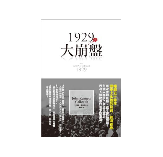 《1929年大崩盤》這本書最早於1954年出版,此後在1955、1961、1972、1979、1988、1997年不斷再版,直到如今已有五十四年。作者高伯瑞是美國二十世紀經濟學界的代表人物,除了作者及書本身的重要性之外,還有一個能讓本書銷量維持不墜的理由:每一次它的出版,另一個可能發生的事件——另一個泡沫或是緊接而來的不景氣——就會激起大家對這段大蕭條和崩盤歷史的興趣,它曾引發一場慘烈的不景氣。